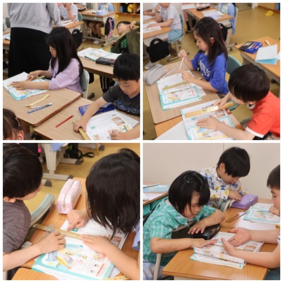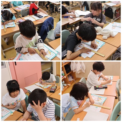 「mm」の学習です。30cmものさしをつかって、はがきの長さを調べました。目盛りが細かく苦労します。