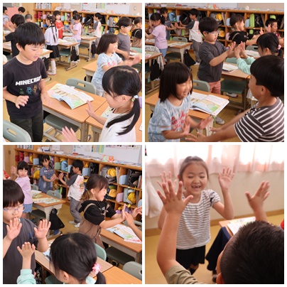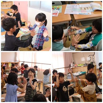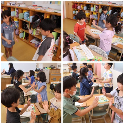 リズムにのって、「足踏み」「膝打ち」「手拍子」などのボディサウンドを入れながら歌っています。この歌が始まるとみんな目が輝きます。とても楽しくお気に入りの曲です。