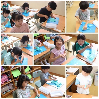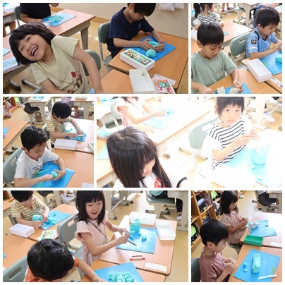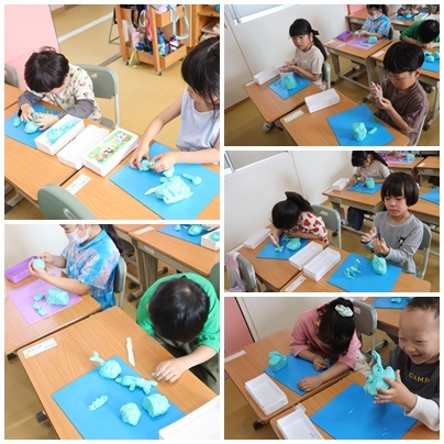 油粘土を使って、動物をつくっています。硬い粘土をこねる表情、つくりたい物を表現しようとする真剣な眼差し。とてもよい表情をしています。