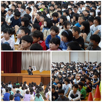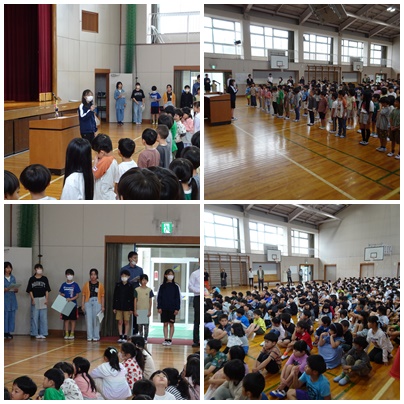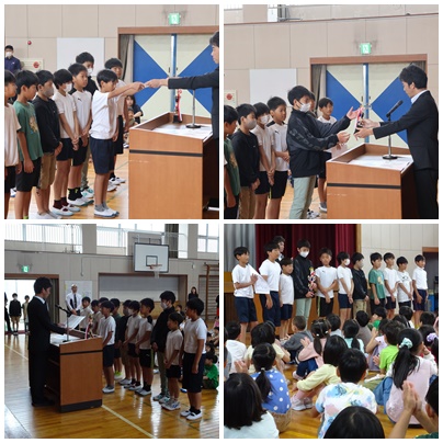 はじめに児童会役員からの緑の募金のお礼です。目標の3倍ほど集まったそうです。次に長根FCの表彰です。新人戦U12で準優勝に輝きました。おめでとうございます。校長からはいろいろなことを見付けるのが得意になるようにと、「ミツケータ君」の紹介をしました。たくさん見付けて、見付けたことを調べてみようとする気持ちを育てていきたいです。