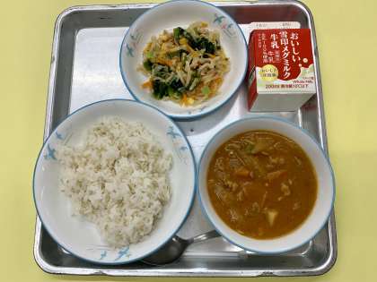 今日の給食は、麦ごはん、ハヤシシチュー、切干大根サラダ、牛乳でした。