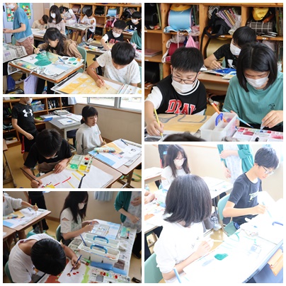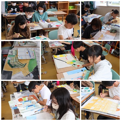 校内の風景を絵に表しました。奥行き、バランス、色の鮮やかさなどに気を付けながら描いています。