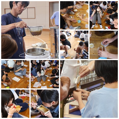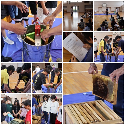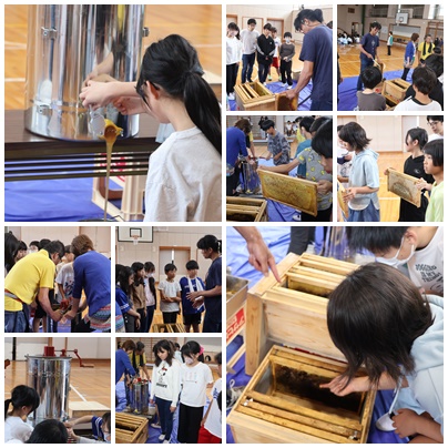 今年度も養蜂教室を開いていただけました。蜜のたまった箱やはちみつが取れる分離機など、テレビでしか見たことがものが目の前で繰り広げられ、体験することができます。みて、触って、味わって・・・子どもたちはとても興奮していました。最後にはちみつをおいしくいただきました。