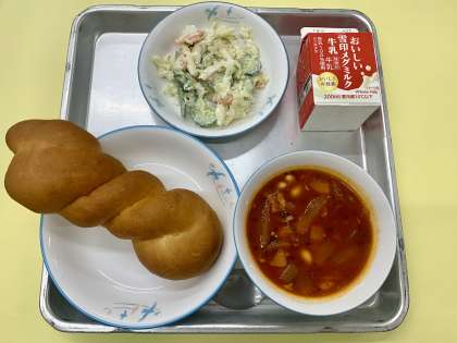 今日の給食は、愛知のクロスロールパン、ポークビーンズ、アスパラガスとマカロニのサラダ、牛乳でした。