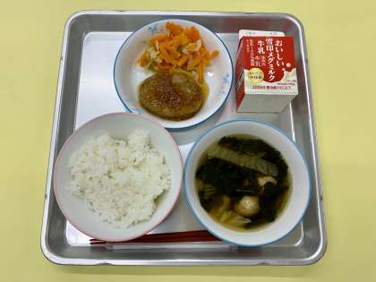 今日の給食は、ごはん、鮭団子汁、ハンバーグのたまねぎソースがけ、にんじんとキャベツのあえもの、牛乳でした。