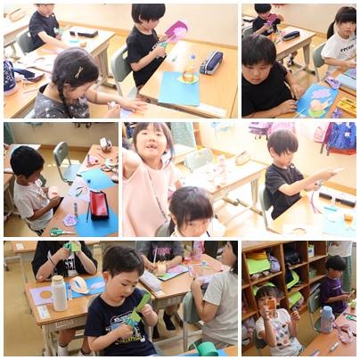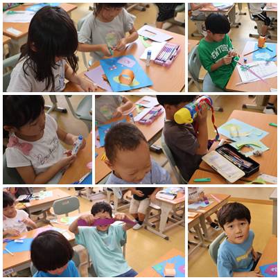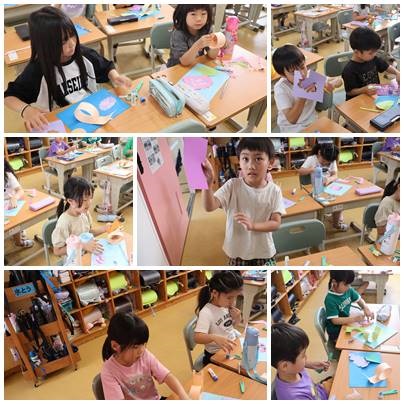 はさみを使って紙を切り、カタツムリとアジサイをつくりました。カタツムリは立体的になっていて、アジサイはとても色鮮やかです。