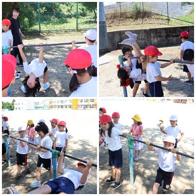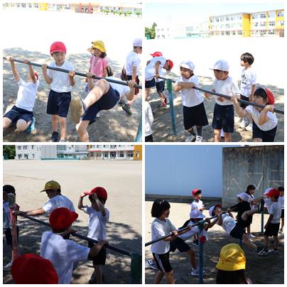 お腹や両ひざでぶら下がったり、足を抜いたりして鉄棒で遊びました。逆上がりが上手にできる子もいました。