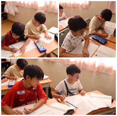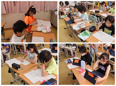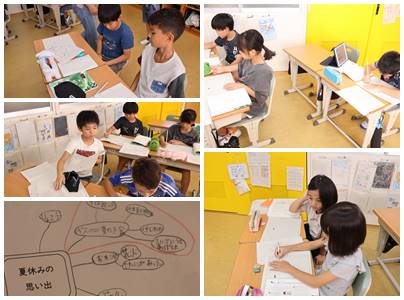 昨日まとめたウェビングマップをもとに、夏休みの思い出の作文を書きます。思い浮かんだことがたくさんメモしてあります。どの思い出にするか選ぶのも大切です。