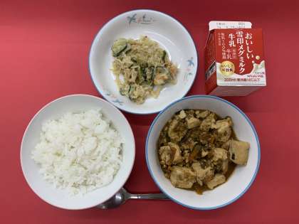 今日の給食は、ごはん、なす入りマーボー豆腐、バンバンジーサラダ、牛乳でした。