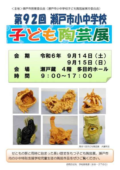 せともの祭の期間中(9/14,9/15 9:00〜17:00)は、瀬戸蔵4F多目的ホールで「子ども陶芸展」が行われます。長根っ子の作品も展示されています。皆様、ぜひお出かけください。