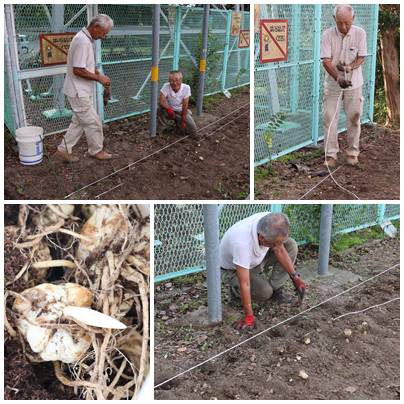 今日は、今年の秋に咲くユリの球根を植えに来てくださいました。全部で250個ほど植えてくださるそうです。花壇には木の根が侵入してきていて、穴を掘るのもとても大変そうです。下校中の子どもたちが興味深そうに見て、「何しているの?」と声をかけていました。10月下旬から11月上旬に咲くそうで今からとても楽しみです。いつもありがとうございます。