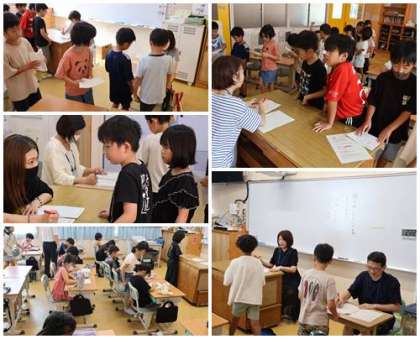 木曜日の朝、ねこ丸隊の日です。今日のねこ丸隊は3年生に来ていただけました。習ったばかりの「あまりのあるわり算」でしたが、丸が欲しいので子どもたちはとてもがんばりました。丸を付けてもらいたい子どもたちの長蛇の列ができました。丸を付けてもらい、声をかけてもらい、子どもたちの自信につながっています。