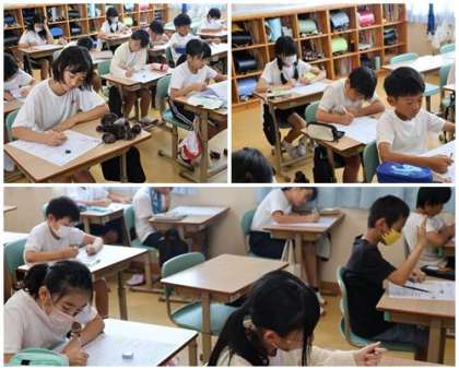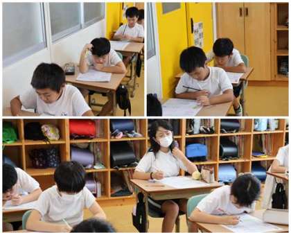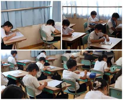 2けたでわるわり算のひっ算のテストをしていました。答えの見当をつけて、大きすぎたり小さすぎたらまたやり直してと、なかなか大変な計算です。しかし、ここでしっかり習熟すれば、この先、何けたになっても同じ要領で計算できるようになります。みんな真剣な表情で取り組んでいました。