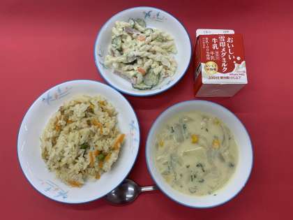 今日の給食は、カレーピラフ、豆乳スープ、マカロニとチーズのサラダ、牛乳でした。