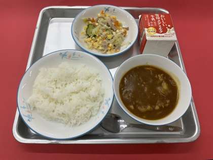 今日の給食は、ごはん、カレー、イタリアンサラダ、牛乳でした。