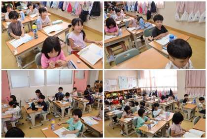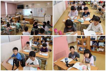 「くじらぐも」です。繰り返す言葉が多いので、誰が言ったことばなのかを確認し、様子を思い浮かべながら音読します。毎年この時期になると、1年生の「天までとどけ、一、二、三。」という元気な声が聞こえてきます。