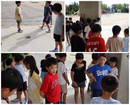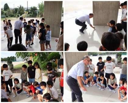 影はどのようにできるのか、どんな向きにできるのか調べます。実験として、影のある場所をチョークでマークしました。さて30分後、影はどうなっているでしょう。30分後は、雲で太陽が隠れてしまい、影がありませんでした・・・。自然が相手の理科では、よくあることです。都合よく人間の思うとおりにならないのが自然であると感じることこそ大切な勉強です。
