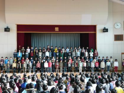 体育館中に響きわたる元気のいい歌声に、1年生から6年生までみんな感心していました。