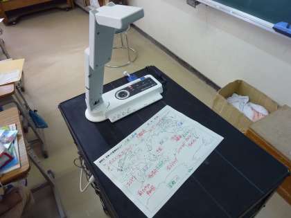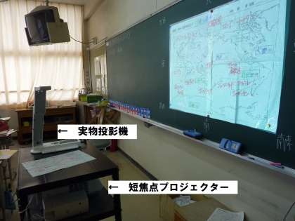 実物投影機を使い、白地図をプロジェクターで拡大して黒板に貼った簡易スクリーンに映しています。
