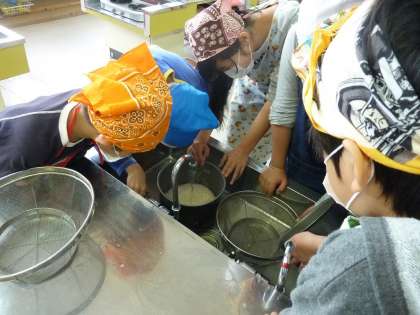 慣れない手つきで包丁を握ったり、お米を流しにこぼさないように洗ったり、苦労しながら作っていきます。