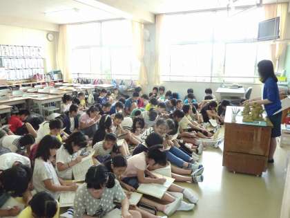 子どもたちは実演を見ながら、土台作り、胴体・腕・足の付け方、顔の表情の作り方など、学習ファイルにポイントを書き込んでいきました。