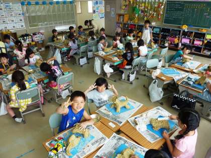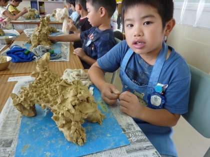 1年生が、大きな粘土を相手に作品作りを頑張っています。