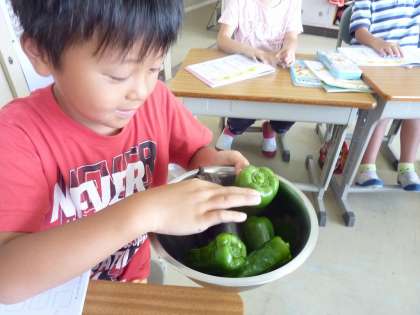 見ると、ボールに入った野菜を見ている子も。