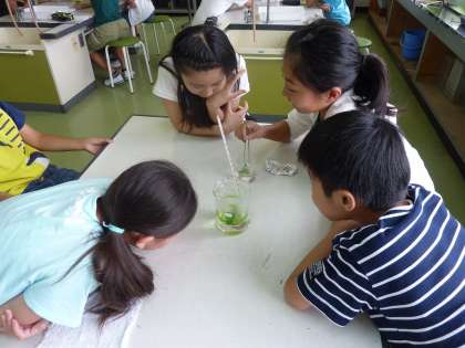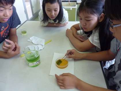 エタノールを使って葉の緑色を抜き、ヨウ素液でデンプンの有無を調べる6年生。