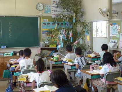 教室に七夕飾りを飾って、涼しさを演出しています。