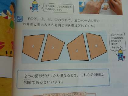 ぴったり重なる図形をみつける「合同な図形」の授業。