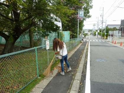 あいさつ運動の後、環境部の皆さんは赤い手袋をして、学校東側フェンス周辺の除草作業をしてくださいました。