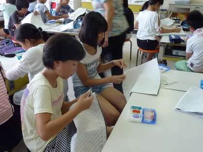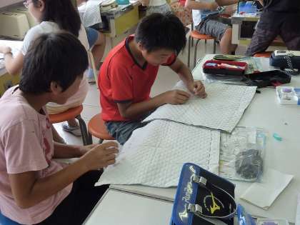 慣れない手つきで奮闘する子もいれば、器用に針と糸を使って要領よく仕上げる子もいます。