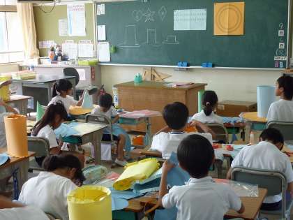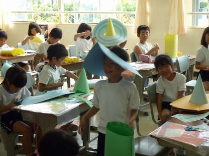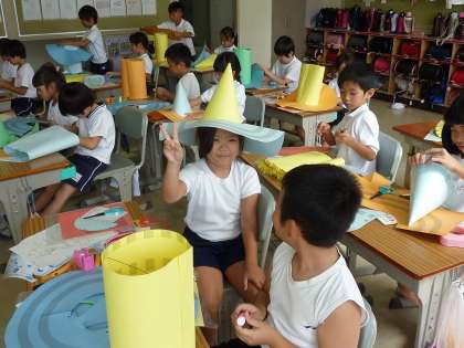 大きな色画用紙を切って、自分のオリジナルハットを作っているのは2年生。
