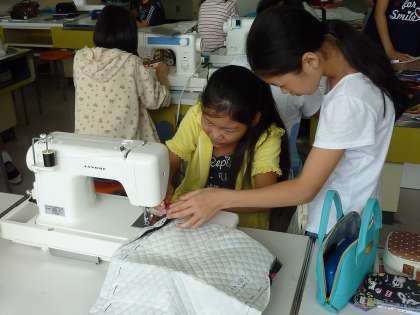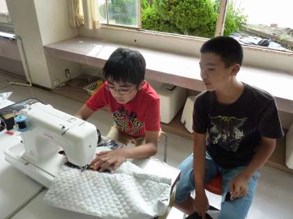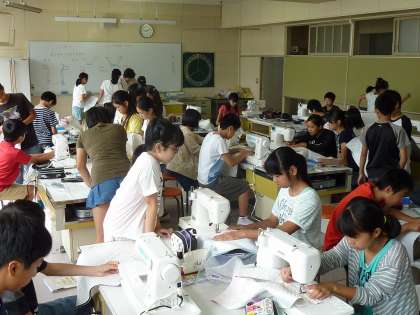 6年生がナップサック作りをしています。