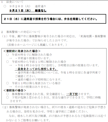 給食については、「21日(水)給食なし」と決まりましたので、状況に応じてお弁当の用意をお願いします。