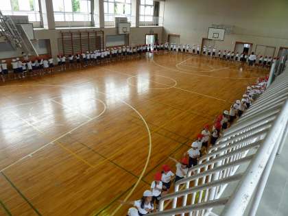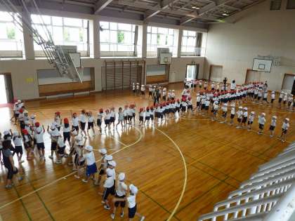 天候がはっきりしない今日の運動会練習は、体育館で行いました。