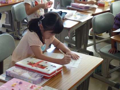 鑑賞シートに、友だちの箱のよいところを書いて、互いの作品のよいところを発表する1年生。
