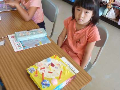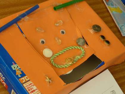 いろいろな材料を持ってきて飾った箱を見て、工夫したところやおもしろいところを書いていきます。