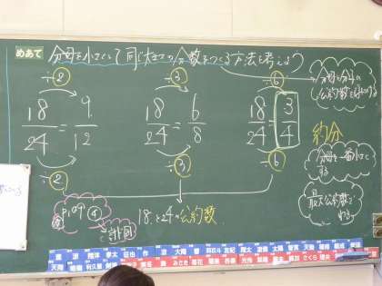 「分母を小さくして同じ大きさの分数を作る方法は、分母と分子の公約数を求めて考えればいい。そのことを約分という。でも約分にはきまりがあり、一番小さい数にすることが必要」