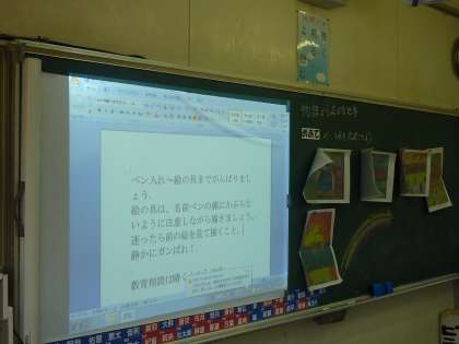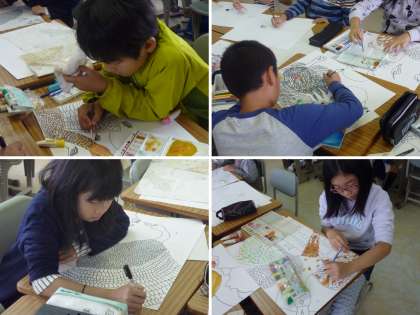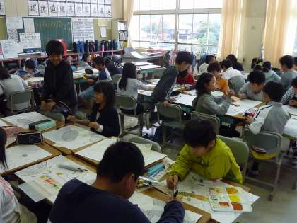 国語の大造じいさんとガンの場面を絵に表す5年生。
