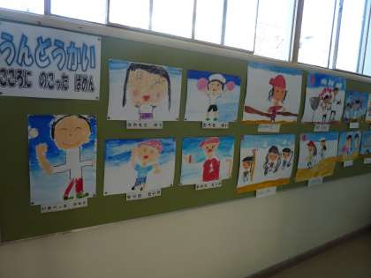 校内の掲示板や教室前に、子どもたちの描いた絵や作品が並んでいます。