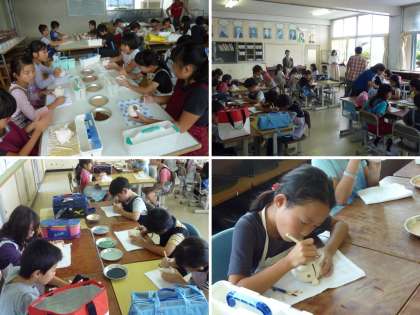 ぶたの貯金箱に、自分の好きなデザインをしていく3年生。