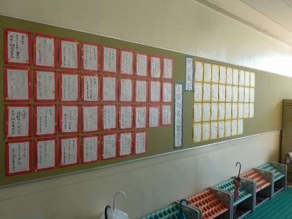 昇降口の掲示された4年生の俳句。