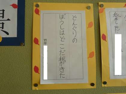 「どんぐりの ぼうしはどこだ 秋がきた」