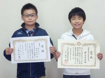 瀬戸市近隣市町24校1636名の中から、最優秀の「愛知県社会福祉協議会賞」と、「優秀賞」に入賞した6年生2名が校長室で表彰されました。