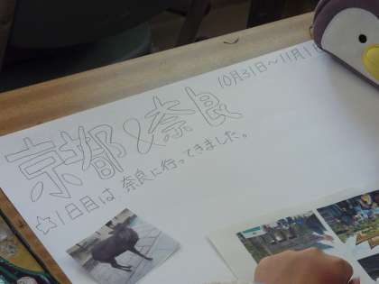 修学旅行で学んだことを、1枚の画用紙にまとめていきます。
