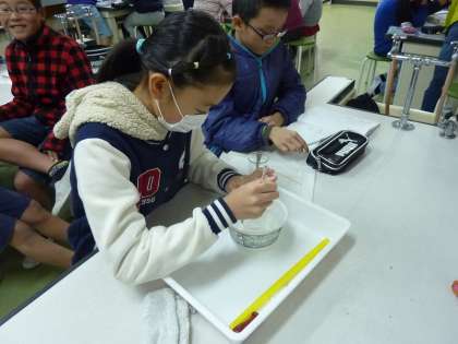 60度のお湯に、食塩がどれぐらい溶けるかを実験しています。
