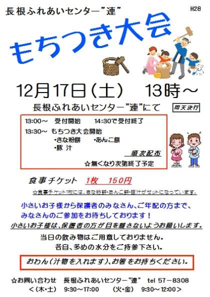 もちつき大会 公開日 2016/12/13 更新日 2016/12/13 地域とともにある学校 12月17日(土)13時より、長根ふれあいセンター”連”にて、もちつき大会が行われます。 詳しくは、以下のチラシをご確認ください。