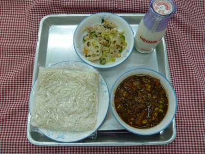 ソフトめん、肉みそかけ、キャベツとれんこんのごま酢あえ、牛乳でした。