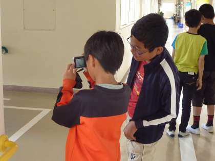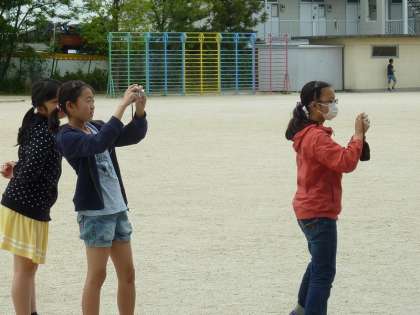 遠近法で絵を描くための、構図を選んでいる6年生。